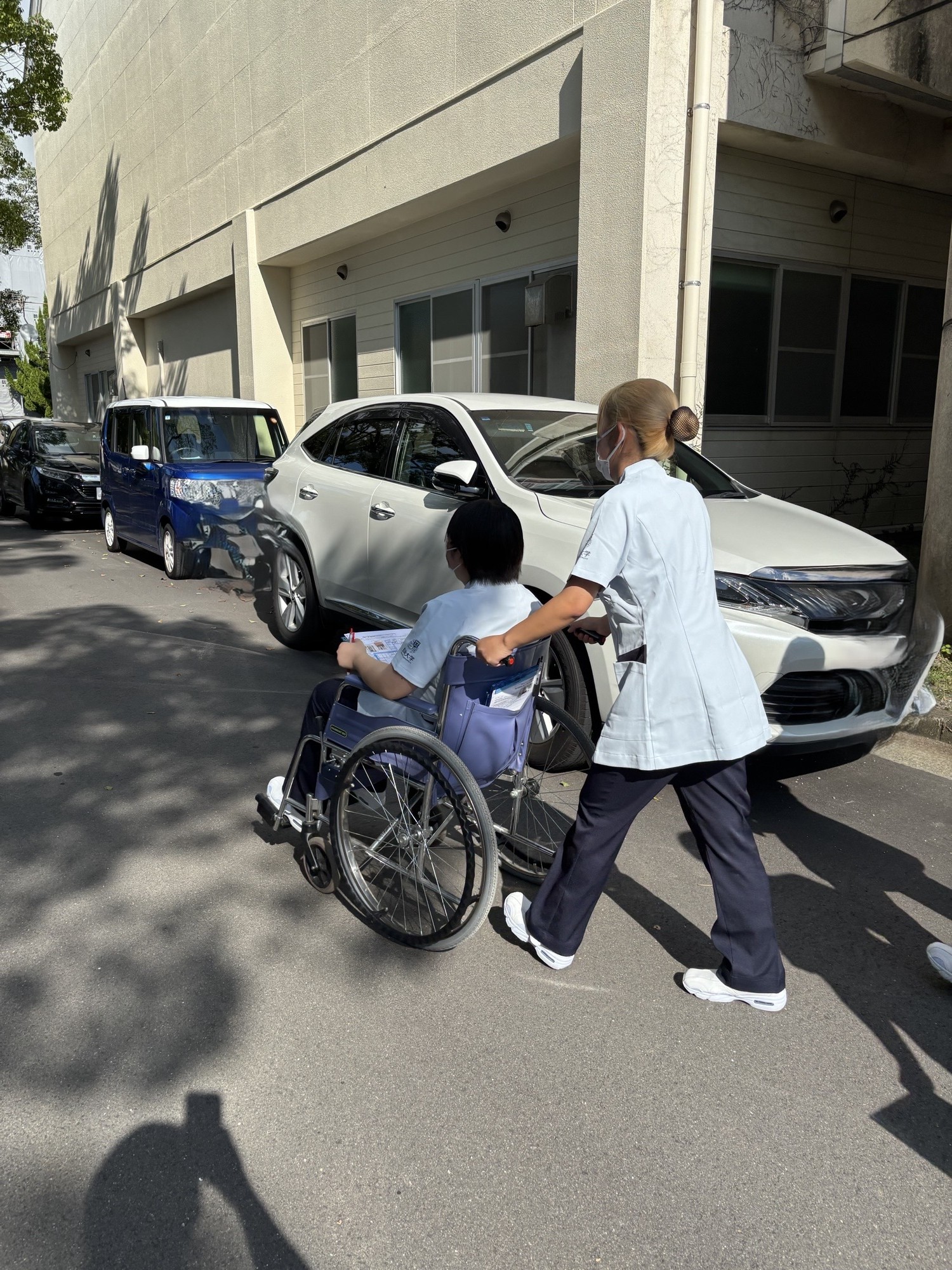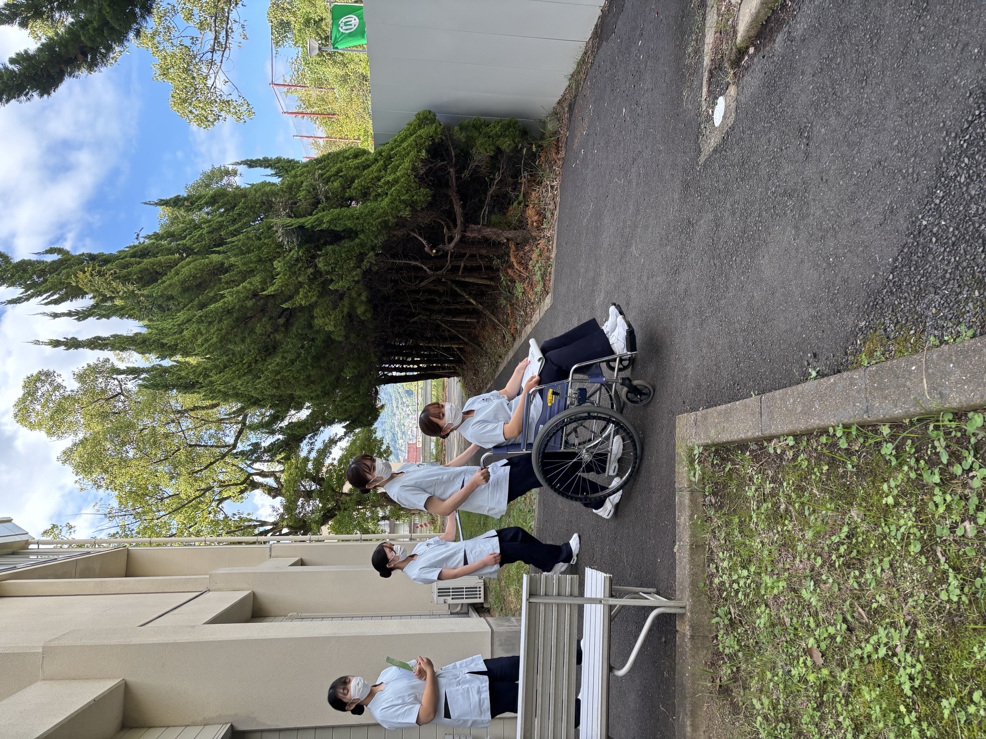 さらに、保健学科の校舎内や渡り廊下、体育館、スロープ、外周などを通り車いす移送の演習を行いました。