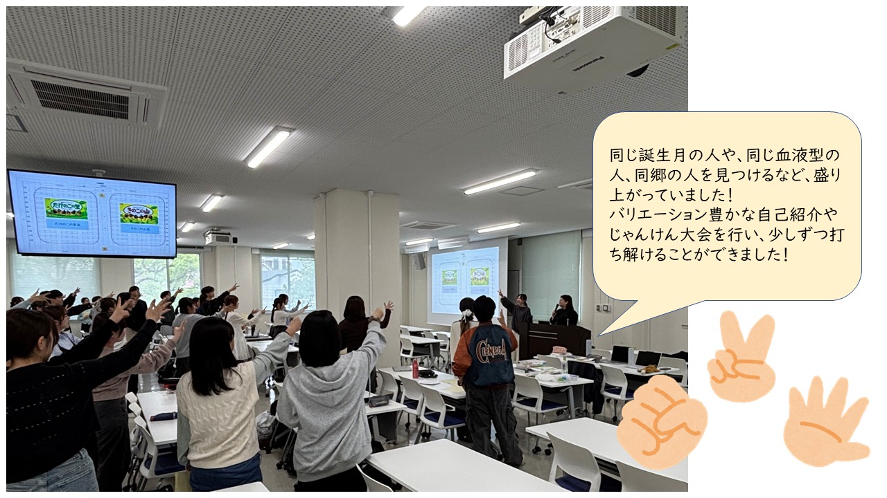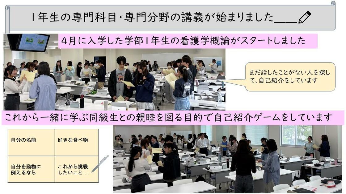 看護学概論の初回授業では、これから講義、演習、実習と共に学ぶ同級生たちと仲良くなってもらうために、自己紹介ミニゲームを取り入れています。