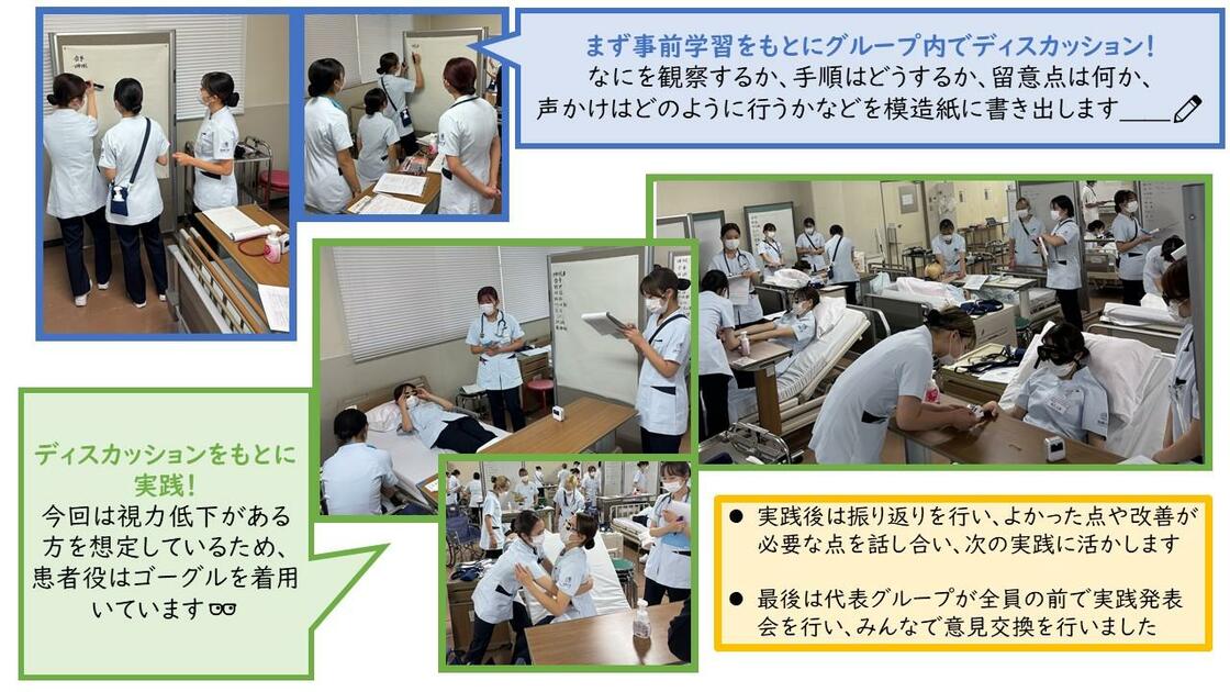 知識や技術だけではなく、態度(どのような声かけや配慮が必要なのか)をみんなで考えました。